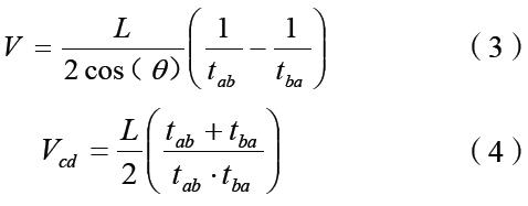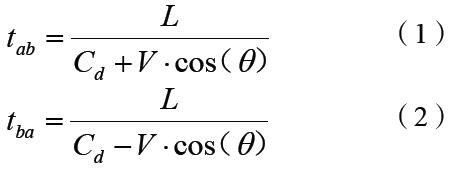 若管線內(nèi)氣流無流動,聲波以相同的速度在管道沿聲道的2個方向傳播;若管線內(nèi)介質(zhì)流速大于0,聲波順氣流方向傳播速度較快,反之則較慢。其中,順氣流方向時間與逆氣流方向時間計算公式為: