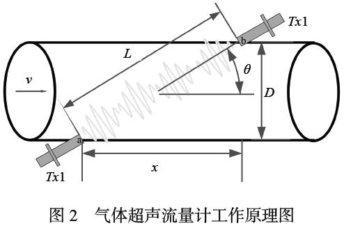 傳播時間差法氣體超聲流量計是通過測量高頻聲脈沖傳播時間得出氣體流量的速度式流量計,工作原理如圖2 所示。超聲脈沖在管道內(nèi)逆流和順流沿斜線方向傳播,傳播速度與介質(zhì)軸向平均流速有關(guān),通過測量聲波傳播時間差,運(yùn)用數(shù)值計算法計算工作條件下通過氣體超聲流量計的氣體軸向平均流速和流量。在充滿氣體的密閉管道中,超聲波傳感器(探頭)沿管壁安裝,直接與氣流接觸,2 個傳感器發(fā)射超聲波后由對方互為接收。圖2 中a、b 為2 個超聲波流量計換能器,聲道與管道傾斜夾角為θ,管道內(nèi)徑為D,聲道長度為L,聲道距離為x。在一些流量計中采用了反聲道,此時聲脈沖在管壁上經(jīng)歷一次或多次反射。