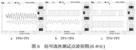 本設(shè)計(jì)在50mm口徑渦街流量計(jì)實(shí)驗(yàn)裝置上進(jìn)行試驗(yàn)。圖8所示為信號(hào)流各測(cè)試點(diǎn)波形圖。圖8a上方的波形為前置放大后.輸出的波形(TPO),壓電傳感器輸出的差分信號(hào)經(jīng)前置儀表放大器輸出轉(zhuǎn)換后,得到的正弦信號(hào),但信號(hào)信噪比相對(duì)較差;下方的波形為經(jīng)過(guò)測(cè)量通道濾波輸出之后的波形(TP1),經(jīng)過(guò)濾波去噪放大處理,得到的高信噪比信號(hào)。圖8b下方波形即是經(jīng)過(guò)測(cè)量通道濾波輸出之后的波形(TP1);上方波形為經(jīng)過(guò)軟件脈沖整形之后輸出的方波信號(hào)(TP4),對(duì)于峰峰值大于設(shè)定閾值的模擬信號(hào),軟件脈沖整形都能正確輸出方波。圖8c.上方波形即為經(jīng)過(guò)軟件脈沖整形之后輸出的方波信號(hào)(TP4),因?yàn)橛写嬖谛∮诿}沖整形閾值的信號(hào),致使輸出方波存在缺波現(xiàn)象;下方波形為經(jīng)過(guò)功率最大頻率點(diǎn)周期估計(jì)之后輸出的波形(TP5),通過(guò)軟件濾波最大程度的復(fù)原了真實(shí)的信號(hào)波形,保證了測(cè)量精度。