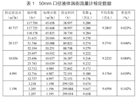 在開(kāi)發(fā)過(guò)程中,渦街流量計(jì)的校準(zhǔn)檢定是必不可少的。通過(guò)校準(zhǔn)可以確定渦街流量計(jì)的性能指標(biāo),尋找影響儀表特性的各種因素,為提高儀表性能提供依據(jù)。本文對(duì)50mm口徑液體渦街流量計(jì)采用靜態(tài)容積法進(jìn)行校準(zhǔn)檢定,其流量檢定范圍為1~50m³/h,流量檢定點(diǎn)分別為2%、10%、20%、40%.91%五點(diǎn)。具體檢定數(shù)據(jù)如表1所示:
