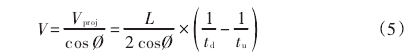 如圖1所示,一對(duì)換能器A和B以聲道長(zhǎng)度L、聲道角φ安裝在流道2側(cè),流體中超聲傳播速度C會(huì)與聲道投影流速Vproj→Vcosφ疊加,造成超聲從下游到上游換能器的傳播時(shí)間tu小于從上游到下游換能器的傳播時(shí)間td那么,其計(jì)算如式1~4所示。