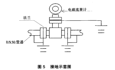 電磁流量計是基于導(dǎo)電性流體在磁場中運動所產(chǎn)生的感應(yīng)電動勢來推算流體流量的測量儀表,其基本工作原理是電磁感應(yīng)定律。因此電磁耦合、靜電感應(yīng)是電磁流量計干擾噪聲的首要來源,在管線上存在雜.散電壓干擾。為了保證液體與地同電位,避免液體與.地有電位差以及因空間電磁干擾而造成的測量誤差,所以,對接地做了嚴格的要求。本裝置與管道為固定法蘭連接,固定法蘭和管道以及流量傳感器均用2.5mm2的銅芯線作了良好的接地見圖5。