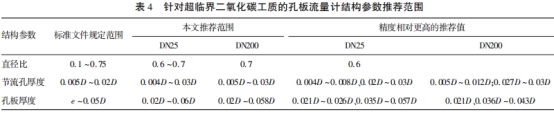 通過對孔板流量計各結(jié)構(gòu)參數(shù)的模擬研究,明確了在進(jìn)行超臨界二氧化碳工質(zhì)質(zhì)量流量測量時,孔板流量系數(shù)隨各結(jié)構(gòu)參數(shù)的變化趨勢與相對誤差,本節(jié)主要對以上模擬結(jié)果進(jìn)行總結(jié)分析,參考《用能單位能源計量器具配備和管理通則》中的準(zhǔn)確度規(guī)定,,給出了針對超臨界二氧化碳工質(zhì)的孔板流量計結(jié)構(gòu)參數(shù)推薦設(shè)計范圍,在該范圍內(nèi)經(jīng)驗計算公式的計算結(jié)果可滿足2.5準(zhǔn)確度等級要求,還進(jìn)一步提出了該范圍內(nèi)精度相對更高的結(jié)構(gòu)參數(shù)推薦值,將以上結(jié)果與現(xiàn)行國際標(biāo)準(zhǔn)ISO5167-2:2003中標(biāo)準(zhǔn)孔板流量計各結(jié)構(gòu)參數(shù)的規(guī)定范圍進(jìn)行對比,如表4所示。